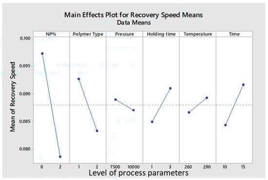 This can be attributed to the fact that the addition of NPs created a discontinuity in the polymer matrix, which caused the sample to take a longer time to recover its original height, hence the slower recovery speed. This observation is in line with observations by Genus and his team [22], who observed that silicon carbide (SiC) nanoparticles damaged the shape recovery feature of shape memory epoxy and shape memory polyurethane (SMPU). This negative impact was ascribed to the dramatic decrease of soft segment crystallinity in the SMPU. It was also noted that holding time under packing pressure had a negligible effect on recovery speed. See Table 6 below.