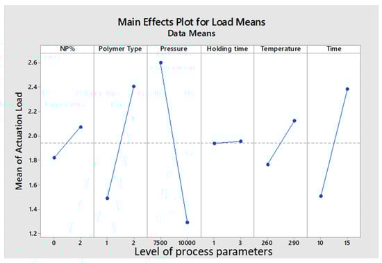 The results showed that as NP%, foaming temperature, and foaming time increased, higher actuation loads were obtained. Additionally, lower packing pressure increased the actuation load. In this test, the JSD polymer was superior in performance to the CC, due to its more rigid structure. A summary of the analysis can be seen in Figure 8 below.