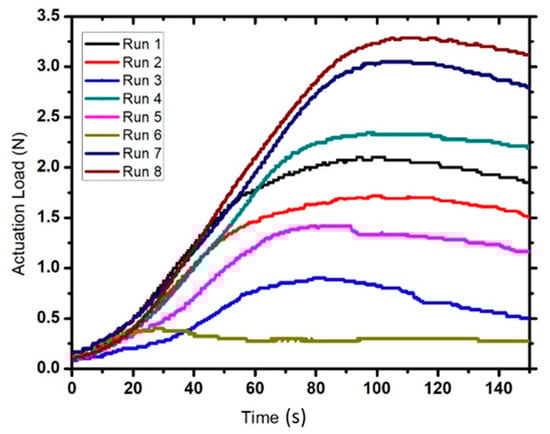 Figure 9 below shows the actuation load curves for every experiment. Each curve represents the average value for each experiment. It can be seen that run number eight (8) had the highest actuation load of approximately 3.35 N, while run number seven (7) was second with a maximum actuation load of 3.016 N. Runs four (4), one (1), two (2), five (5), and three (3) came third, fourth, fifth, sixth, and seventh, respectively, with average actuation loads of 2.35, 2.36, 1.66, 1.46, and 0.9 N. Run number six (6), however, recorded the lowest average actuation load of only 0.45 N. It was observed that all curves had very similar increment rates; it took every sample approximately two minutes (120 s) to reach their maximum actuation load. All samples showed an indistinguishable behavior; after they achieved their maximum actuation load, it started to decrease again, but none reached to 0 N by the end of the experiment period. The lowest actuation loads recorded were 0.25 and 0.35 N for runs three (3) and six (6), compared to maximums of 2.68 N for run number eight (8), and 2.3 N for run number seven (7).