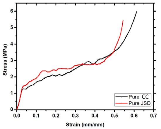 JSD polymer had a higher actuation load than CC. This can be attributed to the fact that JSD has a higher yield strength compared to CC (see Figure 10). Thus, it was able to store more energy. Moreover, foamed JSD is denser than CC (0.29 g/cm3 compared to 0.25 g/cm3), and Figure 11 demonstrates the fact that the volume of 5 g of foamed CC is larger than the volume of 5 g of foamed JSD, and hence was capable of exerting a greater actuation load upon shape recovery process. Both samples showed similar behavior to other foams produced by [15,23]. The graph could be characterized into 3 main regions: A linear elastic region at the beginning, a plateau region in the middle, and a densification area at the end. It is obvious that both polymers featured brittle matrices by the presence of a jagged line in the middle region.