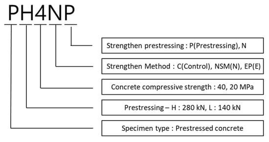 Figure 1 shows schematics of the test specimen details and its cross-section. The basic specimen has a PSC structure even without any application of strengthening. The specimen is 6500 mm long (L), 600 mm high (H), and 3200 mm in length from the center to the end. D-16 steel bars were used for both the compressive and tensile steel bars of the specimen, where three bars were placed for each type, and D-10 was used for tie bars. The material for specimen prestressing was located 257 mm from the lower end, and two SWPC 7 B PS strands (diameters: 12.7 mm) were used. Figure 2 and Table 2 show the descriptions of the specimen types, and Figure 3 shows the details of the strengthening method. There were 12 specimens in total, and only one specimen was tested under varying prestressing forces, different strengthening methods, and different strengthening materials. The specimen was a single PSC structure with a default value of 280 kN used for prestressing. This study performed a comparative analysis of strengthening with the aging of the structure, considering that prestressing was reduced over time that resulted in 50% long-term loss. The compressive strengths of concrete were set to 20 and 40 MPa, and the type of strengthening method was categorized as the control PSC specimen and NSM and EP method cases. In the case of the reinforced material, CFRP was used for the NSM method and PS strands were used for the EP method. Further classification was conducted depending on the prestressing status of the reinforced material. Table 3 shows the material properties of the steel bars, strands, and CFRP bars. The length of the strengthening application in Figure 3 is 4920 mm for NSM and 3500 mm for EP, and anchorage was used.