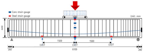 Figure 4 shows the experimental setup for the flexural test of the PSC structure. Thus, the test method is based on KS F 2408 (standard tests for the flexural strength of concrete), but the researcher can select the test method according to their needs and test environment [35]. The test on the PSC specimen was performed 28 days after concrete curing, and the loading test was performed with a 2000 kN universal testing machine. In general, the types of concrete curing consist of dry, wet, and steam curing. In this study, all the test specimens were subjected to dry curing to resemble the environment of the actual construction site. Load control was performed at a speed of 0.03 mm/s for displacements up to the initial 30 mm, and displacement control was performed at a speed of 0.1 mm/s thereafter. Regarding the reaction point, hinged and roller supports were installed at 200 mm from both ends. For the gauge used in this study, strain was measured using a concrete strain gauge (Tokyo Sokki Kenkyujo, Tokyo, Japan), steel strain gauge (Tokyo Sokki Kenkyujo, Tokyo, Japan), and linear variable differential transformer (LVDT, Tokyo Sokki Kenkyujo, Tokyo, Japan). The LVDT was installed at the center of the specimen and at the L/4 points on both sides, the steel strain gauge was installed at the tensile steel bar, compressive steel bar, and L/4 of the tensile steel bar, and the concrete strain gauge was attached at the center of the span, upper and lower parts, and at the upper 1/4 point. For the four-point test, the load was applied at points 500 mm from the upper center of the specimen on both sides. In addition, the data logger TDS-530 was used for measurements.