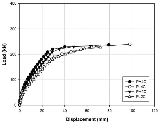 Table 4 shows the load–displacement results, and Figure 5 shows the load–displacement curves of the control PSC specimens PH4C, PL4C, PH2C, and PL2C. Regarding the behavior of the structure, PH4C and PH2C yielded similar behaviors, and PL4C and PL2C were similar to each other. Therefore, in the case of the control specimen, the prestress force of the internal prestressing material, rather than the concrete strength, had a considerable impact on the stiffness of the structure. The ultimate loads were 237.6 and 239.3 kN for PH4C and PL4C, respectively, and the displacements were 79.35 and 98.10 mm, respectively. In contrast, PL2C shows the lowest ultimate load and displacement at 227.3 kN and 71.76 mm, respectively.