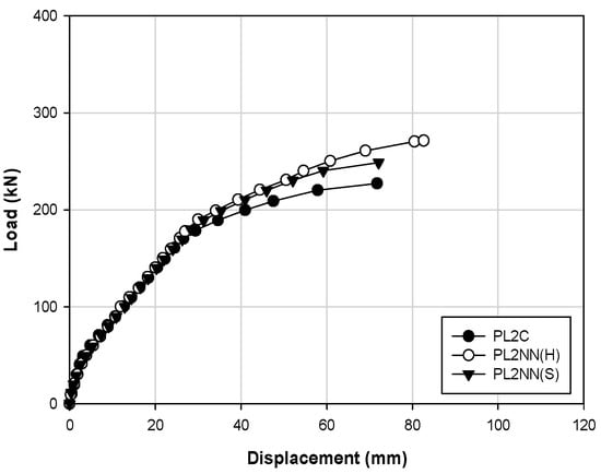 Figure 6 shows the load–displacement curve of the NSM (no prestressing) specimen. In the case of the reinforced material, the performance of products of manufacturers H and S was comparatively analyzed with the control specimen. For specimens PL2C, PL2NN (H), and PL2NN (S), the concrete strength was the same at 20 MPa, and the reinforced material was embedded in one strand obtained from each respective manufacturer. For loads up to the crack load, PL2C, PL2NN (H), and PL2NN (S) showed similar behaviors with load values at 50.6, 46.2, and 42.6 kN, respectively, and displacements equal to 3.57, 3.36, and 2.64 mm, respectively. The yield loads were 180.4, 198.1, and 188.8 kN, respectively, and the corresponding displacements were 30.17, 32.32, and 31.75 mm, respectively. These indicate that the reinforced material of manufacturer H was higher by 8%, but the stiffness shown in the graph is similar. However, from the moment of yielding up to the ultimate load, the loads were 227.3 (PL2C), 271.4 (PL2NN(H)), and 248.7 (PL2NN (S)) kN, respectively, thus indicating that the values of the materials from manufacturers H and S are approximately 20% and 10% higher than that of the control specimen. The maximum displacements were 71.76, 82.64, and 72.12 mm, respectively, and the displacement of the H manufacturer material was larger by approximately 15%. Therefore, in the structural performance evaluation, the result indicates that the material from manufacturer H yielded a superior strengthening effect than the material from manufacturer S.