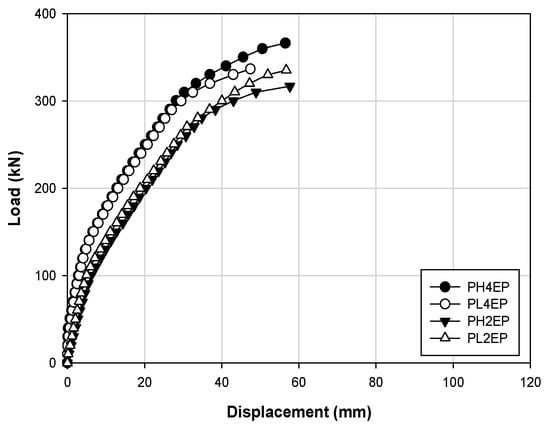 Figure 7 shows the relationship between the concrete strength and strengthening effect in the form of a load–displacement curve and comparatively analyzes the specimens PH4EP, PL4EP, PH2EP, and PL2EP. In the initial stiffness from the crack load to the yield load, the PH4EP and PL4EP specimens show similar trends in behavior, and the PH2EP and PL2EP specimens showed similar behaviors. In addition, the ultimate loads are 356.4 and 336.8 kN for PH4EP and PL4EP, respectively, and the displacements are 56.49 and 47.43 mm, respectively. These outcomes indicate that PH4EP shows higher values, and the ultimate loads are 317.0 and 335.8 kN for PH2EP and PL2EP, respectively. Additionally, the displacements are 57.66 and 56.70 mm, respectively, thus indicating that PL2EP had a higher load value than PH2EP, and the displacement was similar between the two. Furthermore, when comparing PH4EP and PH2EP, and PL4EP and PL2EP, the maximum loads increased by approximately 12.43% and 0.45%, respectively, depending on the concrete strength. Thus, the load has a greater impact on the structural behavior at high strength than at low strength.