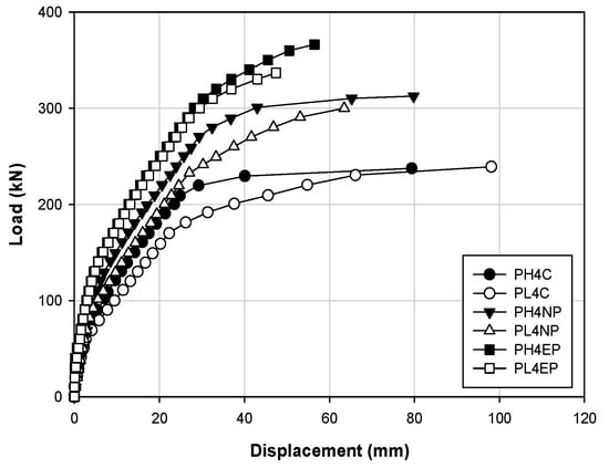 Figure 8 shows the load–displacement curve according to the strengthening method at the strength of 40 MPa, which corresponds to high-strength concrete, with internal prestressing of the member at 280 and 140 kN. From Figure 8, it can be observed that the EP specimens PH4EP and PL4EP have 50–60% higher stiffness than the control specimen. In addition, the NSM (prestressing) specimens PH4NP and PL4NP have 40–45% higher stiffness than the control specimen. When comparing PH4C and PL4C, PH4NP and PL4NP, and PH4EP and PL4EP, the higher the internal prestressing, the higher the stiffness, given that the other conditions are the same. Owing to the additional prestressing of the reinforced material, the EP and NSM specimens have higher stiffness than the control specimen. However, the structural behavior of the EP specimen exhibits brittle characteristics.