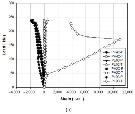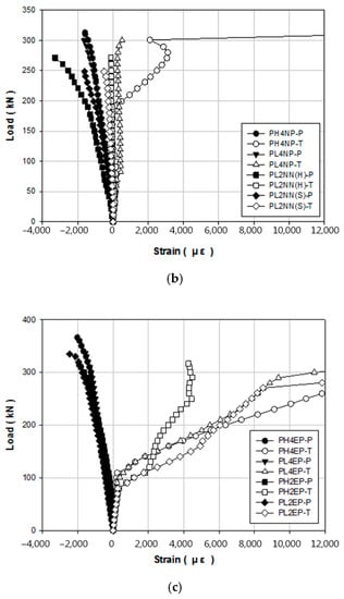 Figure 12 shows the load–strain responses on the compression and tension sides of the reinforced bar for each strengthening method. Figure 12a shows the curve of the control specimen, Figure 12b is the curve for the NSM (prestressing and no prestressing) specimens, and Figure 12c is the curve for the EP specimen. Notably, because the reinforced bar used in this study has a yield strength of 400 MPa, it is predicted to yield when the strain of the reinforced bar will be approximately 0.002 or higher. In Figure 12a, the control specimen yields at approximately 200 kN. In the case of the NSM (prestressing) specimen (Figure 12b) and the EP specimen (Figure 12c), the maximum load is increased up to approximately 300 kN owing to the strengthening effect. However, it can be observed that the NSM (no prestressing) specimen in Figure 12b has a yield point similar to that of the control specimen.