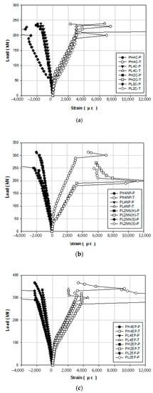 Concrete load–strain responses for different strengthening methods: (a) PSC (control), (b) NSM, and (c) EP.