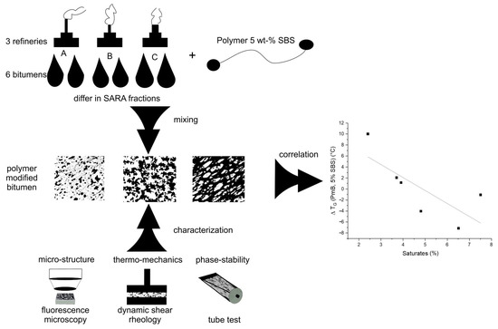 In this study, the properties of six different PmBs were analyzed using dynamic shear rheometry (DSR), fluorescence microscopy, and the tube test. The results of the characterization were then used to correlate the phase stability, polymer swelling, and thermo-rheological properties with the SARA fractions of the respective bitumen. Schematic information on the method is reported in Figure 1.