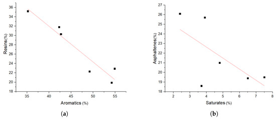 Correlation of SARA fractions for crude bitumen. (a) Resin vs. aromatics and (b) asphaltene vs. saturate content.