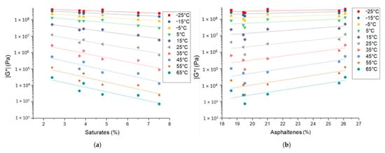 Bitumen |G*| correlation with (a) saturate and (b) asphaltene SARA fractions.
