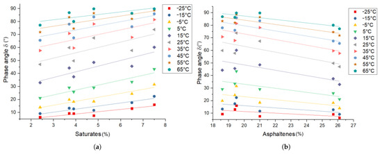 Bitumen phase angle correlation with the (a) saturate and (b) asphaltene SARA fractions.
