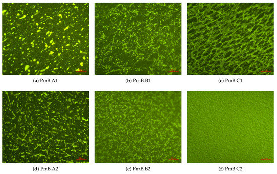 Fluorescence micrographs of different bitumens modified with 5 wt.% SBS at 40× magnification. PmB, polymer modified bitumen.