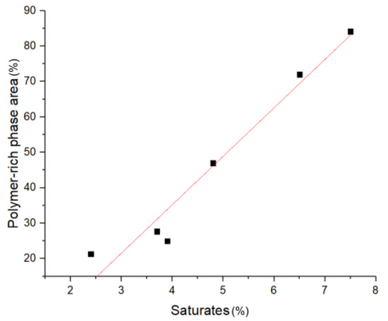 Polymer-rich phase area vs. saturate content. All PmBs are modified by 5 wt.% SBS.