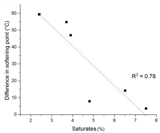 Difference in the softening point (top-bottom) for the tube test of the considered PmBs vs. saturate content.