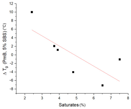 Glass transition temperature (T): In Table 2, the glass transition temperatures of the crude bitumen and the polymer modified bitumen can be seen, while in Figure 9, the difference in the low temperature glass transition of the crude bitumen and the respective PmBs (T) is depicted. Low saturate content leads to an increased T of PmB compared to crude bitumen. This can be explained by the saturates being incorporated into the the polymer-rich phase, leading to a bitumen-rich phase being depleted of low molecular weight components, which in turn increases the T of this phase [25]. Since the bitumen-rich phase is the matrix phase in these PmBs, this increases their T. At higher saturate content, a reduction of T is observed. This can be attributed to the polymer being swollen mainly by the saturate fraction. The polybutadiene section of the SBS polymer exhibits a lower T than the crude bitumen [22]. Therefore, since the polymer-rich phase is the matrix phase in these PmBs, their T is lower.