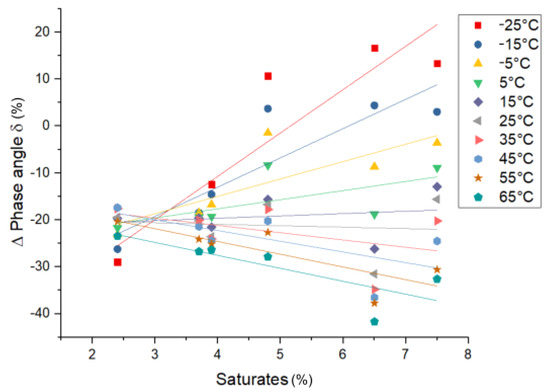 Rheology—phase angle δ: The influence of the saturate content on the phase angle of PmB in comparison to the base bitumen ( (%) = ()/) can be seen in Figure 11. The pure polymer exhibits a phase angle smaller than bitumen at all temperatures. At low saturate content, the polymer-rich phase acts like an elastic filler at all temperatures, thus reducing the phase angle. Additionally, the decrease of the saturate content in the bitumen-rich phase due to migration into the polymer-rich phase causes a relative increase of the asphaltene fraction in the bitumen-rich phase, which is also linked to a lower phase angle (see Figure 5). At higher saturate content, the effect on increases, which can be linked to the increased vol% of the polymer-rich phase (swelling). At lower temperatures (−25–5 °C), the polymer-rich phase increases the phase angle. This can be explained by the incorporation of saturates, which shift the combined T of these two components to lower temperatures (T = −60 °C [26]) and therefore increase the phase angle. At higher temperatures (25–65 °C), the polymer-rich phase decreases the phase angle, since the bitumen-rich phase is increasingly liquid, and the polymer-rich phase retains elasticity until the polystyrene domains melt at their glass transition temperature (T = 100 °C). The correlation of the asphaltene, aromatics, and resin fractions with the phase angle is found to be not significant in the considered data set.