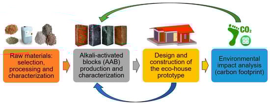 Figure 1 presents a graphical abstract of the methodology used in this research, which includes the execution of four stages or phases: (1) the selection, characterization, and processing of the raw materials, (2) the production and characterization of the alkali-activated blocks, (3) the design and construction of the eco-house prototype, and (4) the analysis of the environmental impact (carbon footprint).
