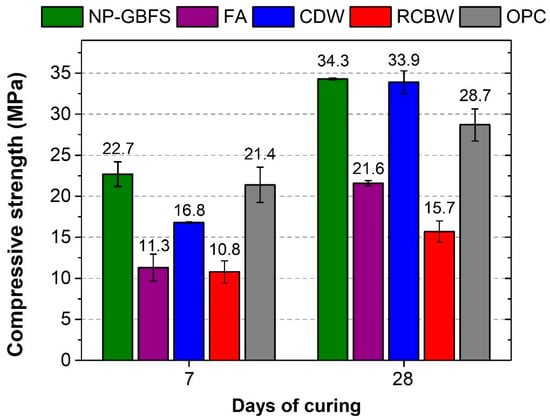 Figure 2 shows the compressive strengths (7 and 28 days) reached by the alkali-activated (NP–GBFS, FA, CDW, and RCBW) and reference (100% OPC) mixtures. The compressive strength values reported for the NP–GBFS, FA, CDW, and RCBW mixtures at 28 days of curing were 34.3, 21.6, 33.9, and 15.7 MPa, respectively, compared with the 28.7 MPa reached by the reference mixture based on 100% OPC. The high strength (33.9 MPa) of the CDW mixture was highlighted, taking into account that both the binder (90%) and the aggregates (100%) (fine and coarse) corresponded to CDW. In general, the alkali-activated mixtures exhibited a higher strength gain than the OPC mixture between 7 and 28 days, reporting 51.1% (NP–GBFS), 91.2% (FA), 101.8% (CDW), and 45.4% (RCBW) compared to the 34.1% for the OPC mixture. This finding highlights an important technological advantage of these materials; the strength of alkali-activated materials has been shown to increase over time [,] without the strict processes of wet curing or immersion in water that OPC-based (hydraulic) materials undergo to achieve this behavior [].