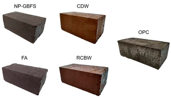 Table 3 shows the proportions of the mixtures for each type of block, including the alkali-activated blocks (NP–GBFS, FA, CDW, and RCBW) and the reference blocks based on 100% OPC. The designs of these mixtures were based on the “absolute volume” methodology proposed by ACI 211.1 []. In the case of the alkali-activated mixtures, the contents of the alkaline activator (NaOH + SS + water) and precursors were selected based on previous studies (NP–GBFS [,]; FA []; CDW []; RCBW [,]).