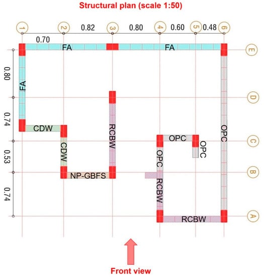 Figure 6 presents a structural drawing (scale 1:50) of the eco-house prototype that defines the types of blocks used in the construction of each confined masonry wall and their dimensions. Note that for future comparative purposes (e.g., in thermal measurements, long-term and durability changes), some walls (axis 4 # B–C, axis 5 # C, axis C # 4–5, and axis 6 # A–E in the structural drawing) were built with reference blocks (OPC).