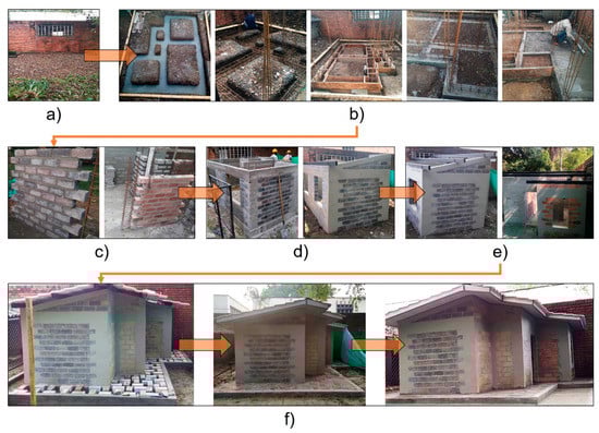 Construction process of the eco-house prototype: (a) adaptation of the terrain, (b) casting of concrete foundations and floor, (c) wall construction, (d) casting of confining columns and beams, (e) installation process of roof, and (f) construction of platforms and final finishing of the eco-house prototype.