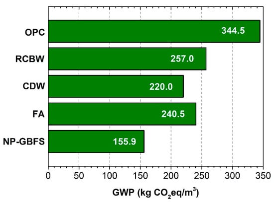 However, note that the NP–GBFS block has the highest environmental sustainability, yielding the lowest total GWP value (155.9 kg∙CO2∙eq/m3), because this block does not contain OPC as a calcium addition but instead, unlike the FA, CDW, and RCBW blocks, uses GBFS as a calcium source, which has a lower CO2/kg value (7.42 × 10−2) than the OPC (8.45 × 10−1) (Table 6). Note that authors such as Habert et al. [], Komnitsas [], and Scrivener et al. [] reported that alkali-activated mixtures that incorporate GBFS have lower environmental impact because they require less alkaline activator, which is corroborated in the mixture designs reported in Table 3.