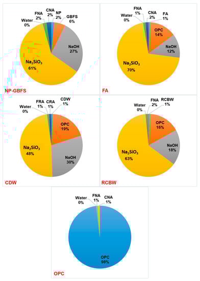 Figure 9 shows the contribution (%) of each raw material to the GWP (Figure 8) of each of the concrete mixtures and/or block produced. As anticipated in the inventory of raw material emissions (Table 6), OPC and alkaline activators (NaOH and Na2SiO3) generate the most CO2 in mixtures and/or blocks. In the case of the alkali-activated blocks, the percentage contribution of the alkaline activators (NaOH and Na2SiO3) ranges between 77.8 and 88.2%, with the alkaline activators making the highest contribution to the total GWP for the NP–GBFS block.