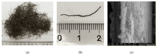 Recycled steel fibers (RSFs): (a) general view of multi RSFs; (b) general view of the geometry of a single RSF; and (c) SEM micrograph of the surface of a single reference RSF (magnification: 1000×) [].