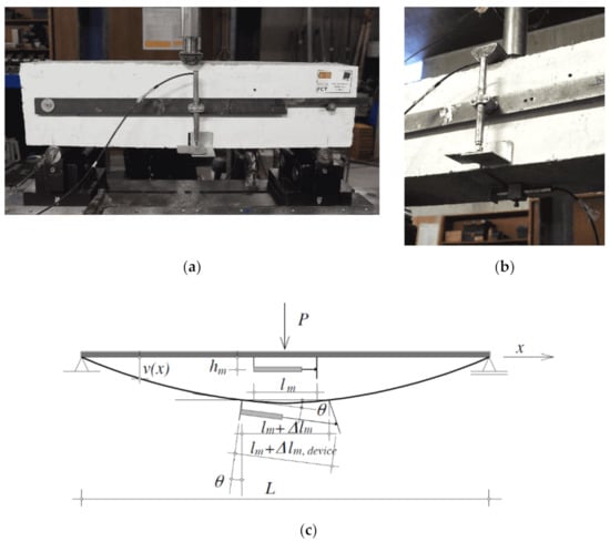 Test setup for three-point notched beam bending test (3PNBBT): (a) specimen front view; (b) specimen bottom view; and (c) measurement of non-linear tensile deformations—initial position of the measurement device and rotation of measurement points caused by rotation of the beam [].