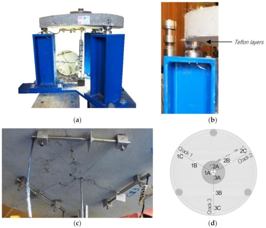 The round panel test supported on three points (RPT-3ps) setup: (a) the three pivots support system []; (b) connection between the panel and each pivot; (c) positions of the linear variable displacement transducers (LVDTs) for central deflection measurement and of LVDTs for crack width measurement; and (d) position of the crack width measurement with a USB microscope (“A”—At the center of the panel; “B”—At a distance of 145 mm from the panel center; “C”—At a distance of 275 mm from the panel center).