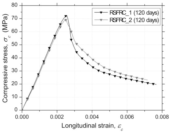 Average compressive stress–longitudinal strain curves obtained in compression tests of RSFRC_1 and RSFRC_2 batches (120 days).