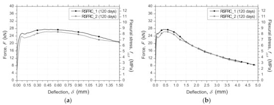 Figure 5 presents the average 120 days force/flexural stress–deflection () relationship, obtained for the notched beams RSFRC_1 and RSFRC_2. Regarding the pre-peak behavior, after the cracking load has been attained, the RSFRC beams presented a small decrease of flexural capacity until a deflection at which the fiber reinforcement mechanisms started being mobilized and controlling the crack opening process (Figure 5).