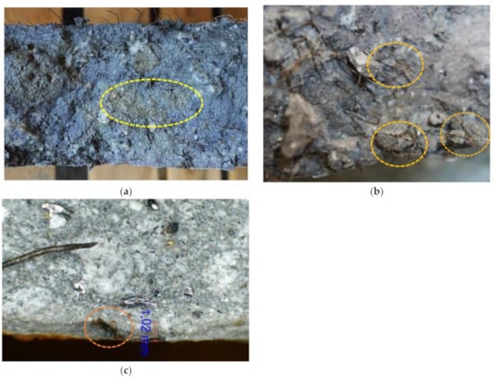 As shown in Figure 6b, some RSFs at cracked surfaces presented corrosion products, mainly near the bottom of the exposed face of the panels, where the crack width was higher and closer to the chloride solution. It seems that the RSFs’ corrosion occurred mainly at the fiber length crossing the crack width (in direct contact with the chloride solution) (Figure 6b). However, few corrosion spots were detected by microscopic inspection on RSFs up to 1–3 mm deep, located on a cut surface orthogonal to a crack, as observed in Figure 6c.