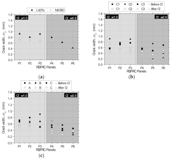 Figure 7b represents the comparison between the crack width measurements performed with the microscope for each crack, C1, C2, and C3 (average of the three measurements at positions A, B, and C; Figure 3d), before and after continuous immersion/dry-wet cycles, i.e., before introducing the panels into the tanks and after removing them from the tanks and placing in the test setup for the final RPT-3ps. According to the results of Figure 7b, a slight reduction of the crack width occurred in the three cracks of the panels after the chloride exposure (on average, 0.10 mm for the panels with the higher pre-crack width level and 0.07 mm for the panels with the smaller pre-crack width level). High dispersion of the results was observed between the measurements at the three different cracks (CoV ranging from 3% to 60%), probably due to the irregular character of RSFs’ geometry crossing the cracks.