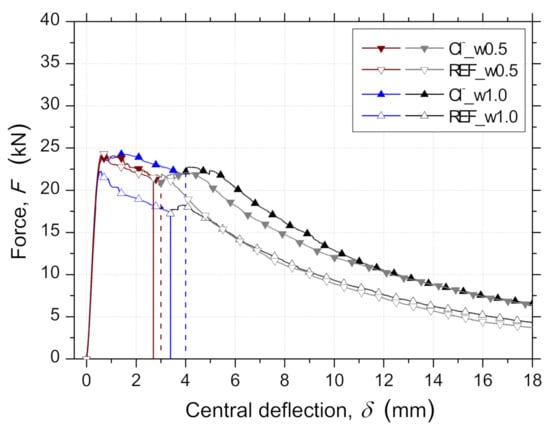 Figure 8 presents the average force–central deflection responses, , registered in the RSFRC panels, during the pre-cracking process (initial load/unload cycle) and after the environmental exposure period of 90 days of dry–wet cycles/immersion. The average pre-crack widths, (after unloading), based on microscope measurements, are indicated in Table 5 and were close to the target crack widths of 0.5 mm and 1.0 mm.