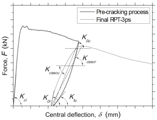 For the relationship obtained in each pre-cracked panel, the parameters of stiffness represented in Figure 9 were determined, namely, the initial stiffness, , initial unloading tangent stiffness, , final unloading tangent stiffness, , initial reloading tangent stiffness, , unloading secant stiffness, , and reloading secant stiffness, . The results obtained of the normalized stiffness parameters are presented in Table 5.