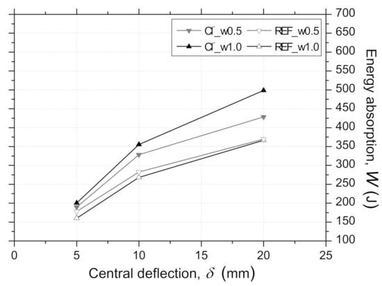 The average values of energy absorbed by the RSFRC panels, , up to a central deflection, , of 5 mm, 10 mm, and 20 mm are presented in Figure 10. These values were corrected considering the panel thickness by using Equation (4) recommended by ASTM C1550-08 [], where is the corrected energy absorption (J), is the measured energy absorption (J), is the nominal thickness of 75 mm, is the measured panel thickness (mm), is the nominal diameter of 800 mm, is the measured panel diameter (mm), and is the specified central deflection at which the energy absorption is evaluated (mm).