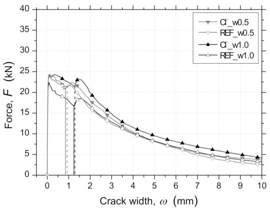 Average force–crack width () relationships for panels from RPT-3ps after the exposure period of 90 days.