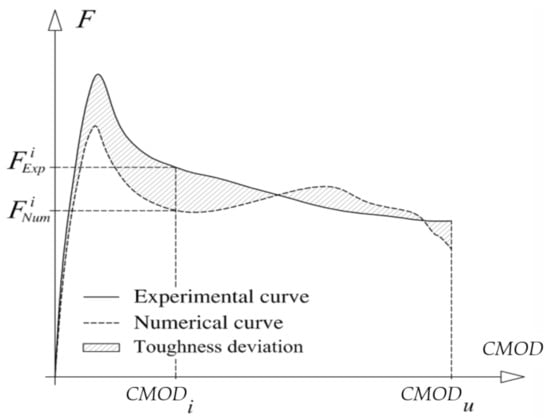 Schematic representation of the force–crack mouth opening displacement () registered experimentally and obtained numerically by the inverse analysis.