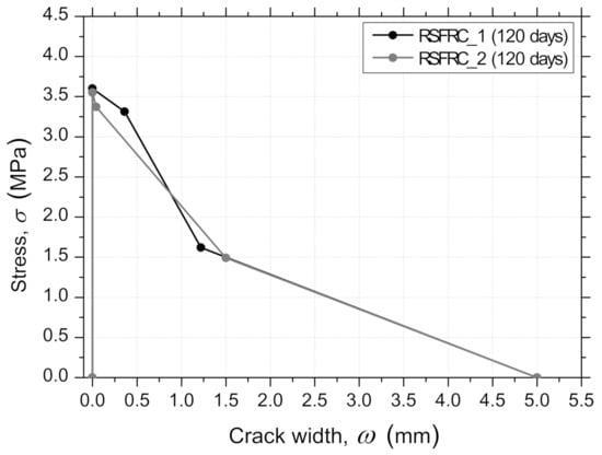 The obtained parameters defining the relationship, and the equivalent fitting error, , are indicated in Table 8, where is the tensile strength, and are, respectively, the stress at the first and second post-peak point of the crack opening, and , and is the ultimate post-peak point of the crack opening. The graphical representation of these laws is presented in Figure 14. For the same crack width level, no significant differences in the parameters were observed (Figure 14).