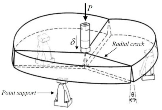In the numerical model used, proposed by Salehian et al. [,], it is assumed that in RPT-3ps, just after the peak load, three dominant cracks propagate in the panel, subdividing it into three rigid plates (Figure 15 []), whose elastic deformation is recovered in the structural softening stage when cracks are opening gradually. The elastic deformation that occurred in the pre-cracking stage of RSFRC panels (the deformation registered up to the central deflection of 0.17 mm, on average) was neglected because it was much lower than the deflection imposed to implement the target crack width (3.15 mm on average). Therefore, the vertical deformation of the panel’s center, δ, was attributed to the rigid rotation of the plates in turn of their connecting dominant cracks. For the sake of simplicity, it is assumed that the cracks are straight and radiate from the panel’s center (Figure 15) [,]. The model considers work equilibrium conditions, the tensile properties of RSFRC, and uses the above-mentioned moment–rotation approach. Further details on this numerical model can be found in Salehian et al. [,].