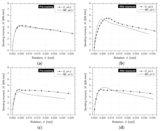 Moment–rotation (M − θ) relationships obtained by inverse analysis from RPT-3ps of RSFRC panels with the target ωcr of 0.5 mm (a) during the pre-cracking stage and (b) after environmental exposure; and the target ωcr of 1.0 mm (c) during the pre-cracking stage and (d) after environmental exposure.