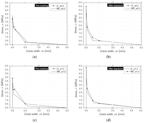 Stress–crack width () relationships obtained by inverse analysis from RPT-3ps of RSFRC panels with the target of 0.5 mm (a) during the pre-cracking stage and (b) after environmental exposure; and the target of 1.0 mm (c) during the pre-cracking stage and (d) after environmental exposure.