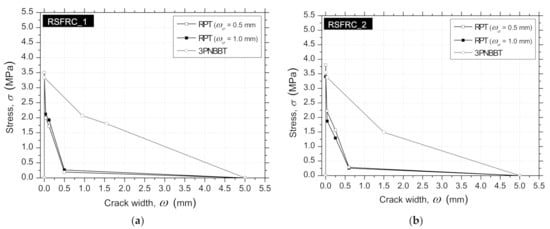 Stress–crack width () relationships obtained by inverse analysis from RPT-3ps and 3PNBBT for: (a) RSFRC_1 batch (b) RSFRC_2 batch.