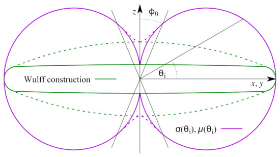 In Figure 1, we plot the anisotropy function Equation (10) for an anisotropy strength β = 10. This function, originally proposed by Debierre et al. [50], has the advantage that regardless of the imposed anisotropy strength the Wulff-construction does not develop sharp corners, where certain high energy orientations are excluded. Generally, these corners or “ears” in the Wulff-construction should be avoided, as the phase-field evolution is ill-posed for these interface orientations [51,52]. To avoid a non-differential cusp in the anisotropy function for interface orientations close to ±π/2 a threshold angle φ0 has been defined [50]. In Figure 1, we compare the anisotropy function as well as the respective Wulff constructions for the cases φ0 = π/100 (solid lines) and φ0 = π/8 (dashed lines).