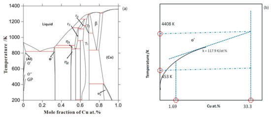 (a) Calculated Al-Cu phase diagram based on TCAL5 by means of Thermal-Calc [53]; and (b) schematic illustration of the linearization of FCC phase boundary in the phase diagram [55].