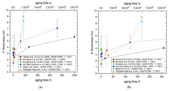 Figure 3 shows a summary of results from different sources for θ′ thickness after aging [17,60,61,62,63]. The data from Häusler et al. [58], Bourgeois et al. [60] and Rodrigues-Veiga [63] are from HR(S)TEM. Note that aging was either at 180 °C or 200 °C. It is striking that the thickness after 17 h/180 °C (black full square, Häusler et al. [58]), Figure 3b and after 24 h/200 °C (red full square, Bourgeois et al. [60]) agree quite well, considering the error bar and differences in time and temperature. Also, the thickness value for 1 h aging of Bourgeois et al. [60] is very reasonable because it is close to the minimum thickness observed for θ′ in general: 2 unit cells in c-direction, i.e., 1.16 nm (see Stobbs and Purdy [64]). Therefore, the mean value for the θ′ thickness was calculated using the histograms given in Figure 5 in [60], which is 1.5 nm +/− 0.6 nm. This value was then used for the volume fraction calculation of θ′ for 1 h using the approach described in [58]. The data for 5 h and 10 h from [48] were not further considered as the thickness data from CTEM is less reliable.