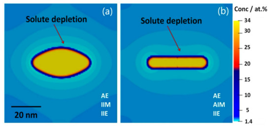 Three-dimensional (3D) phase-field simulations were performed with the simulation box size being 100 × 100 × 100. Two-dimensional (2-D) cuts of the concentration field for a single precipitate with isotropic/anisotropic interfacial mobility can be seen in the Figure 4a,b, while keeping isotropic interfacial energy and anisotropic elasticity the same. The light blue areas depict the regions in the matrix around the precipitate that are solute depleted.