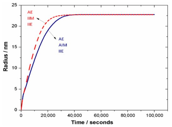 The temporal evolution of the θ′ precipitate is described by its equivalent radius ()), Figure 5. The anisotropic interfacial mobility has reduced the kinetics of the precipitation process at the early growth stage (blue curve). Later, when the equilibrium is reached, same radii (volume fractions) are achieved.